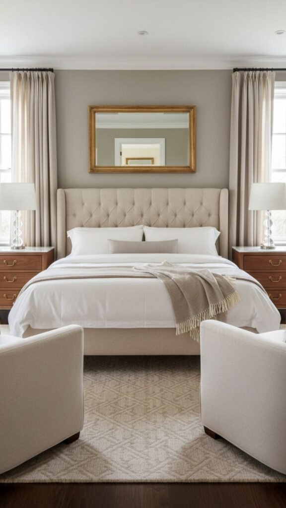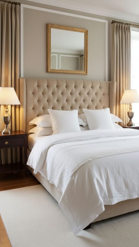An upholstered headboard instantly elevates the bedroom with its soft, tactile appeal. Choose velvet, linen, or leather in neutral tones like cream, taupe, or charcoal for a sophisticated focal point that anchors the room.
