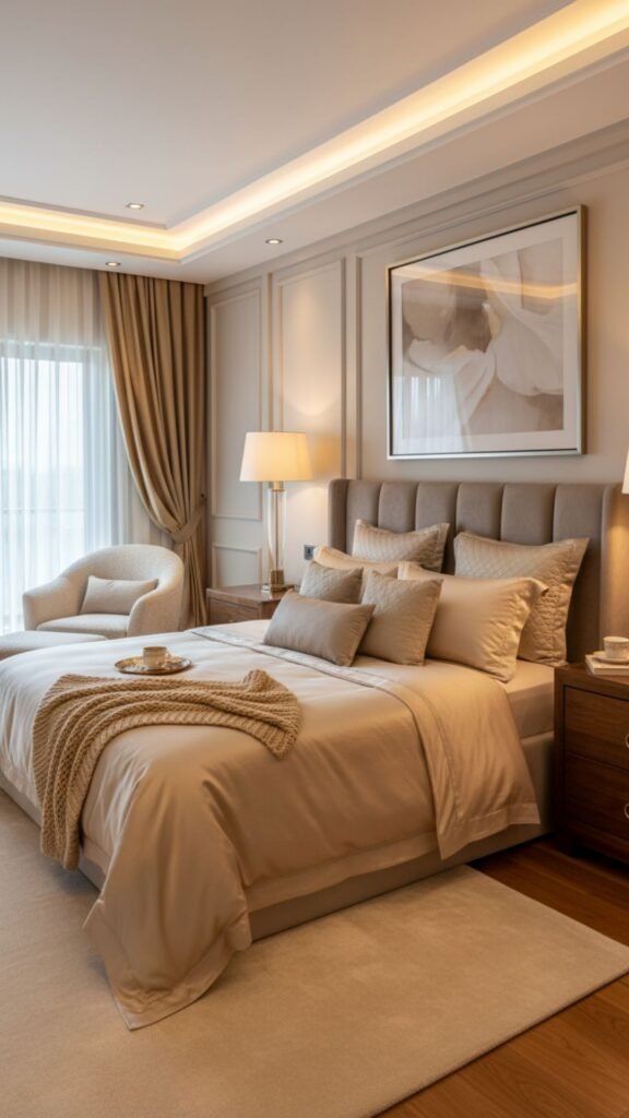 Neutral palettes featuring cream, taupe, champagne, and soft grays create a timeless foundation. Add depth with jewel tones like emerald, sapphire, or burgundy through accent pieces like curtains or throw pillows.