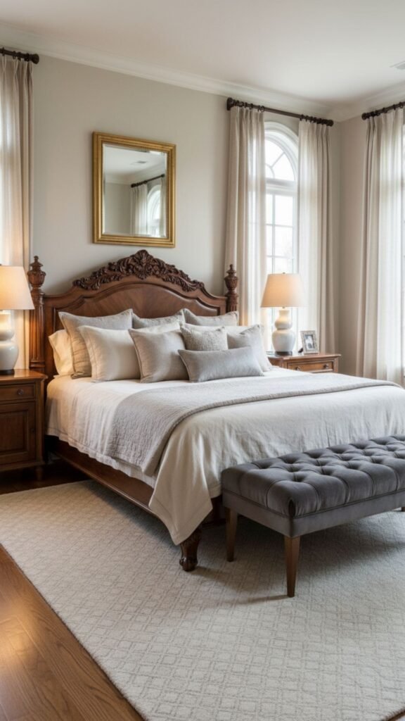 Proper lighting sets the mood. Elegant table lamps on matching nightstands provide ambient lighting while serving as decorative elements that enhance your bedroom’s classic aesthetic.