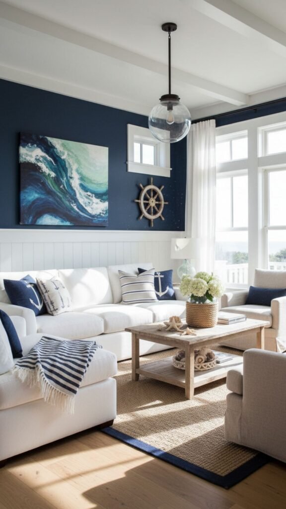 Nothing says coastal quite like the classic contrast of deep navy blue and stark white. This combination brings a slightly preppy, tailored look to your open-plan space. It offers a subtle nod to sailing culture without overwhelming the room with anchors and ship wheels.
