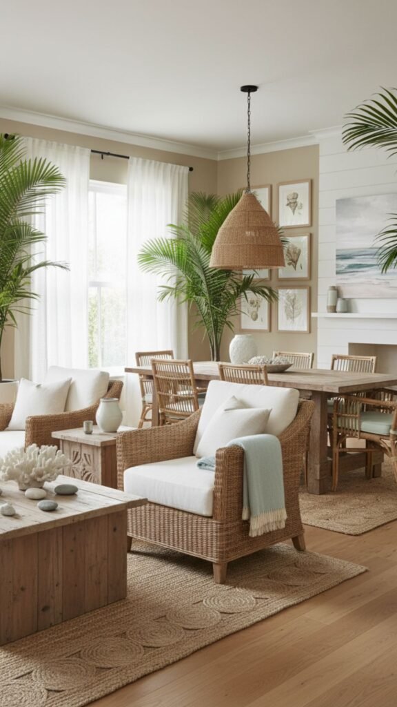 Bringing organic, natural materials indoors is essential for a true coastal feel. Rattan, wicker, and jute add warmth and earthy texture that softens modern lines. These woven elements bridge the gap between outdoor beach living and indoor comfort.