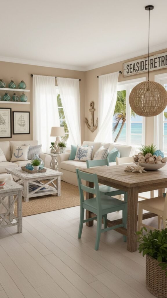 By combining your living and dining areas with a cohesive, beach-inspired design, you can make your space feel open, inviting, and effortlessly stylish. Here are nine gorgeous combinations to help you achieve that perfect breezy vibe.