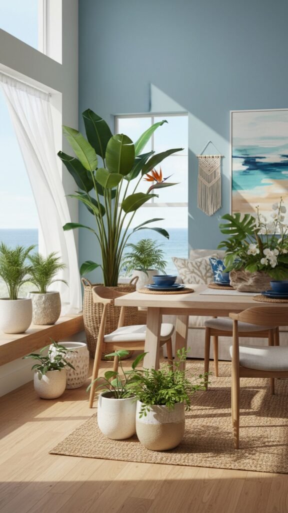 Coastal design pairs beautifully with lush, vibrant plant life. Adding large, leafy plants brings a touch of the tropics and infuses the room with life and color. Greenery creates a seamless transition between your indoor space and the natural world outside.