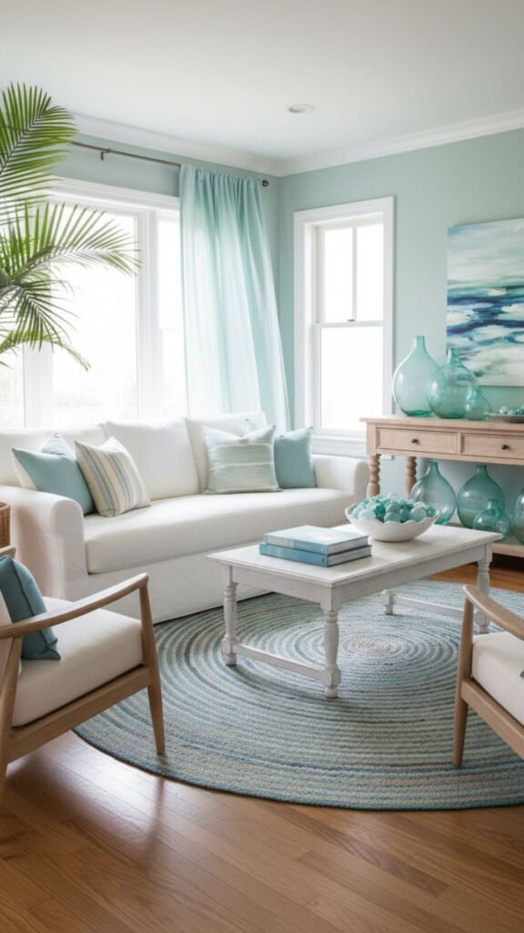 The most effective coastal palettes mirror the beach environment. Focus on crisp whites, sandy beiges, warm creams, and various shades of blue ranging from soft aqua to deep navy.