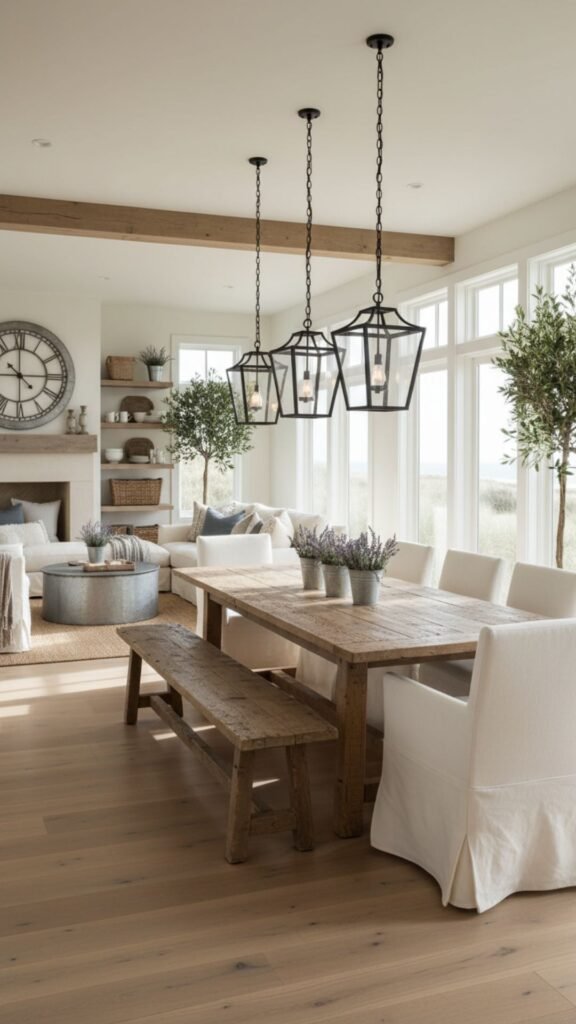 Blending the relaxed vibe of coastal decor with the cozy elements of a modern farmhouse creates a welcoming, family-friendly space. This hybrid style relies on comfortable seating, rustic touches, and plenty of oceanic charm.