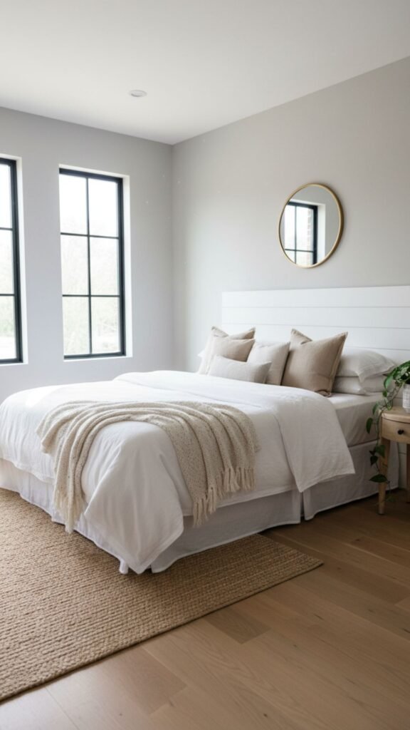 Architectural salvage meets bedroom design with vintage window frames. This unexpected approach adds dimension and storytelling charm.