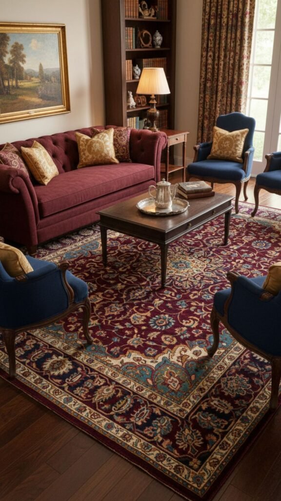 A highly detailed rug grounds the room and ties disparate colors together. The intricate patterns of a Persian-style rug forgive wear and tear while adding a sense of history and warmth to your floors.