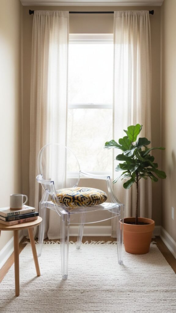 A clear acrylic chair is the ultimate eclectic wildcard. It provides functional seating without taking up visual space, making it perfect for smaller rooms that already feature heavy patterns.