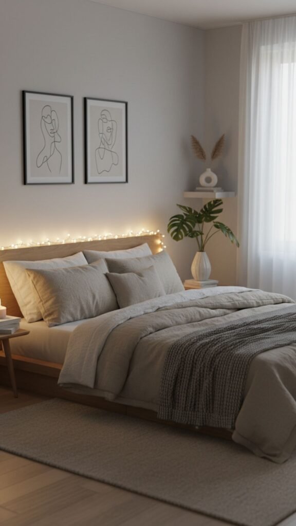 - Drape LED string lights along the headboard or ceiling perimeter
