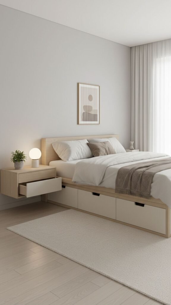 Korean bedrooms maximize functionality with clever storage that keeps clutter hidden and maintains the minimalist aesthetic.