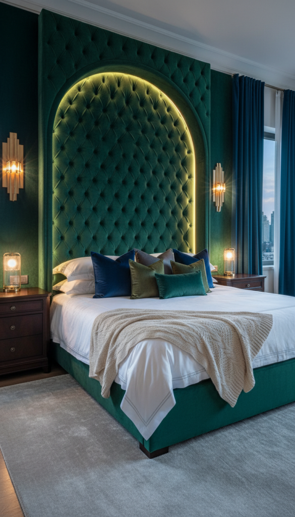 The bed is the natural focal point of any bedroom. To instantly upgrade the glam factor, swap out a basic frame for a tall, upholstered headboard. Velvet or tufted leather adds immediate sophistication and provides a comfortable backrest for late-night reading.