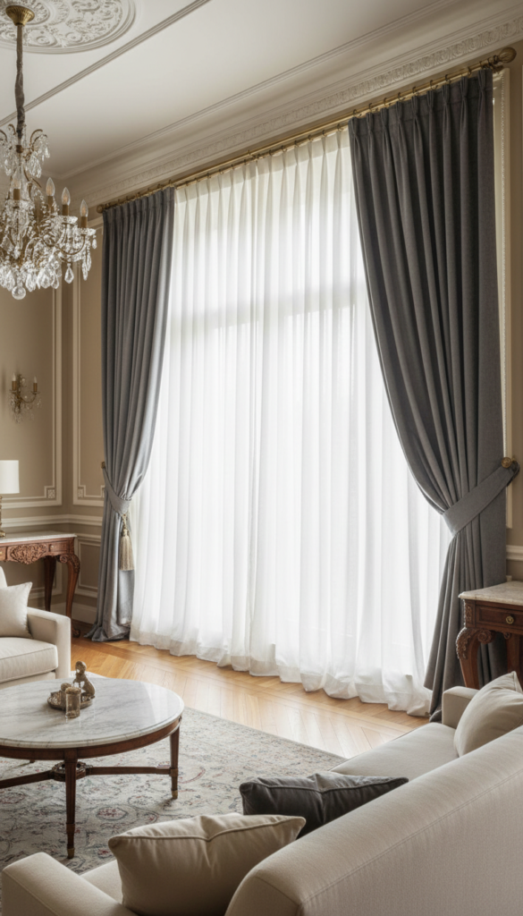 Short curtains can make a room look unfinished and small. To achieve a grand, palatial feel, window treatments should command attention and elongate the walls.