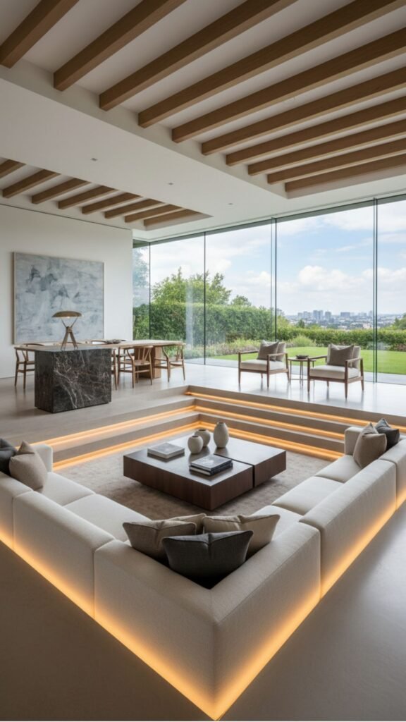 Introducing a slight change in floor elevation naturally separates the living room from the rest of the open-plan area. A sunken or raised living room brings architectural interest and a cozy, intimate feel to a sprawling footprint. It clearly defines the relaxation zone while keeping sightlines entirely open.