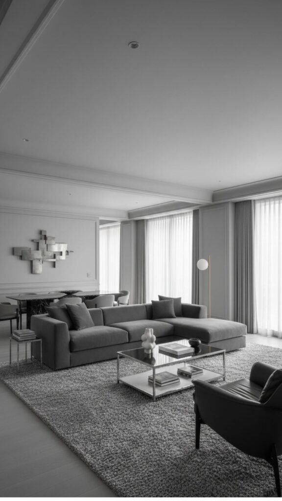 Color drenching involves painting the walls, ceiling, and trim in a single, sophisticated hue. In a large open-plan space, this technique creates an enveloping, cohesive atmosphere that feels incredibly high-end. It prevents the distinct zones from looking cluttered by providing a calm, unified backdrop.