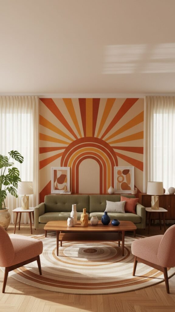 A hallmark of the 1950s, the sunburst motif brings warmth and energy to any living room. This mural features an oversized, stylized sun design dominating a single accent wall, usually in warm tones like ochre or terracotta. It radiates outward, drawing the eye toward the center of the room and establishing a cheerful atmosphere.