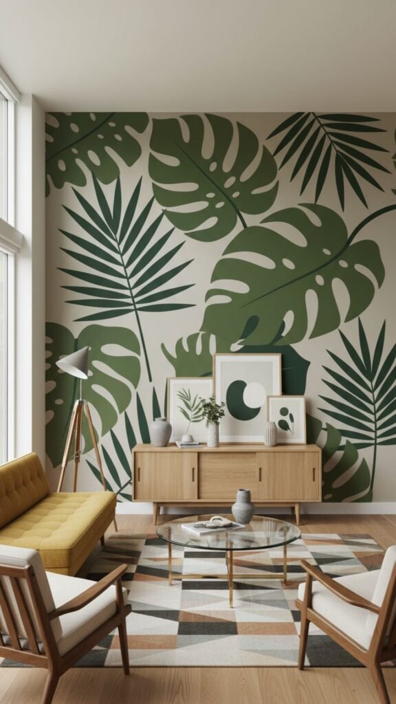 Mid-century design often incorporates elements of the outdoors, and oversized tropical leaves are a classic choice. This mural uses abstract, simplified leaf shapes—like monstera or palm—in varying shades of green, layered over a light background. It introduces a calm, natural vibe while maintaining a highly stylized, graphic look.