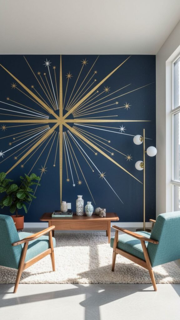 Inspired by the space race, atomic starbursts are incredibly nostalgic and visually engaging. This mural dots a dark, moody accent wall with scattered, asymmetrical starburst shapes in metallic gold or bright white. It gives the living room a dynamic, retro-futuristic edge that pairs beautifully with sleek wood furniture.