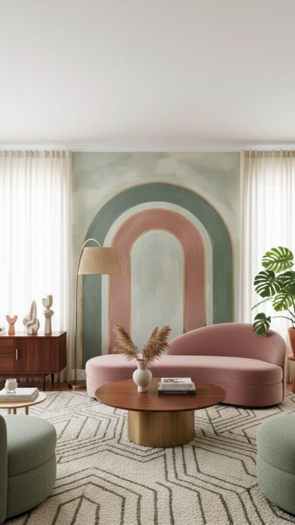 Archways offer a softer approach to geometric murals, introducing curved lines that soothe the eye. This design involves painting large, solid-colored arches that can frame furniture, mirrors, or shelving units. Muted tones like sage green or dusty pink work exceptionally well for this subtle yet impactful retro feature.