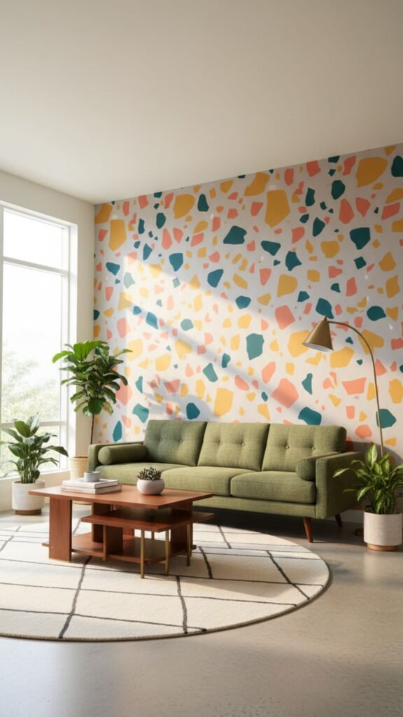 Terrazzo was a hugely popular flooring material in the mid-20th century, and its speckled look translates beautifully into a mural. This design features scattered, irregular, multi-colored “chips” painted across a solid background. It adds wonderful texture and a playful, confetti-like atmosphere to the living area.