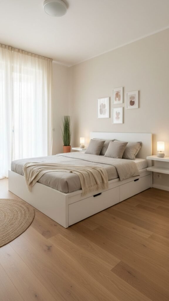 A platform bed with under-bed storage drawers is one of the smartest investments for a small bedroom. It eliminates the need for a bulky dresser while keeping your essentials close at hand.