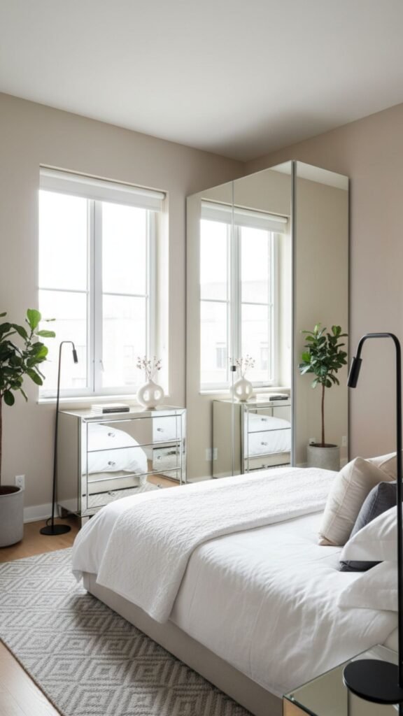 Mirrors reflect light and visually expand a room. Mirrored furniture—like a wardrobe, dresser, or side table—serves a practical purpose while making your small bedroom feel twice as large.
