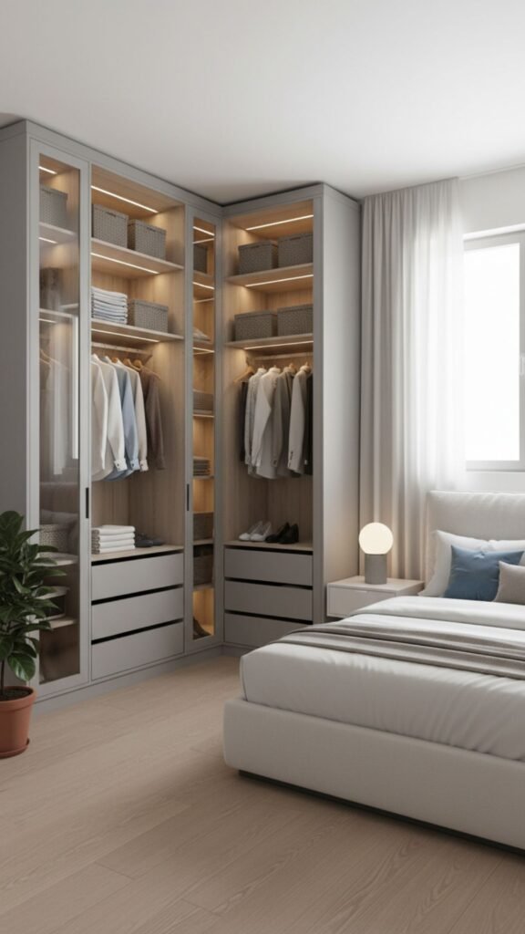 Corners are some of the most underutilized spaces in a bedroom. A corner wardrobe or modular closet system makes use of that awkward space and maximizes every inch.