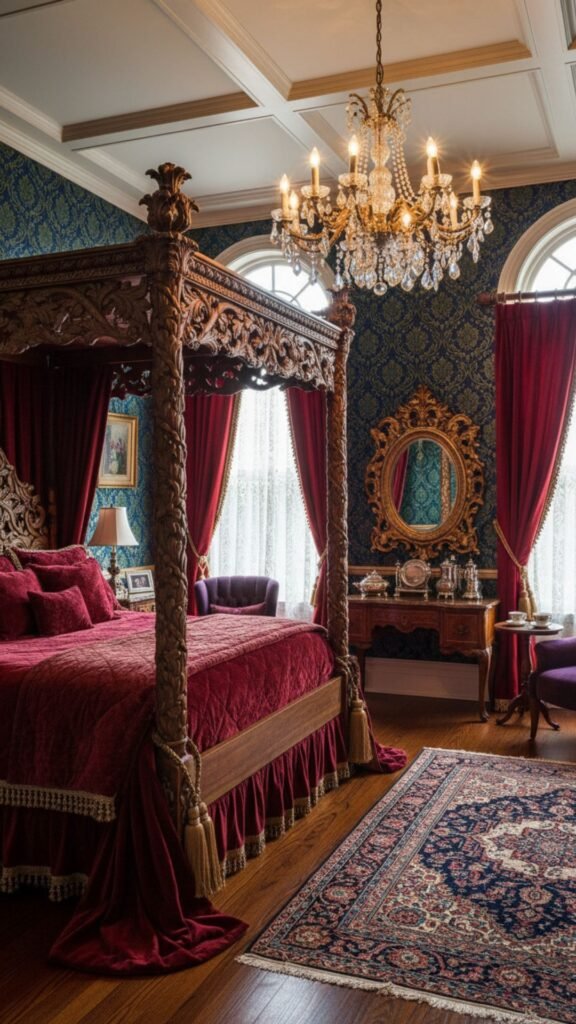 Create an opulent retreat with ornate details and luxurious fabrics. Victorian-style bedrooms feature rich colors, elaborate patterns, and antique furniture pieces that exude old-world elegance.