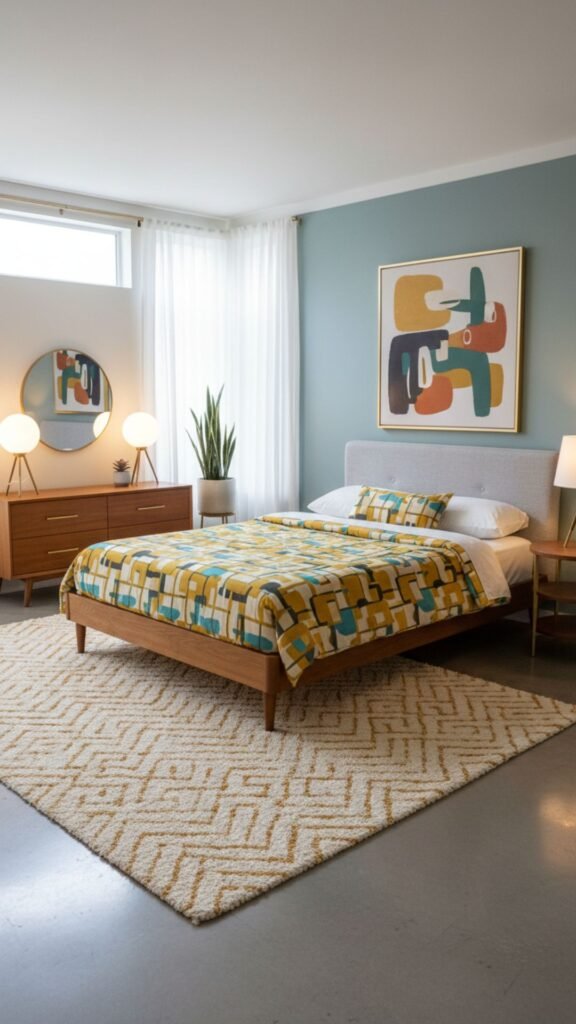 - Use geometric bedding in mustard, teal, or orange