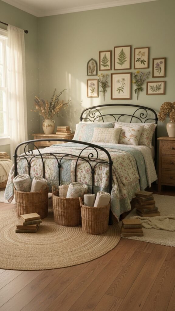 Create a cozy, nature-inspired retreat with floral patterns, natural materials, and handmade touches that evoke countryside living.