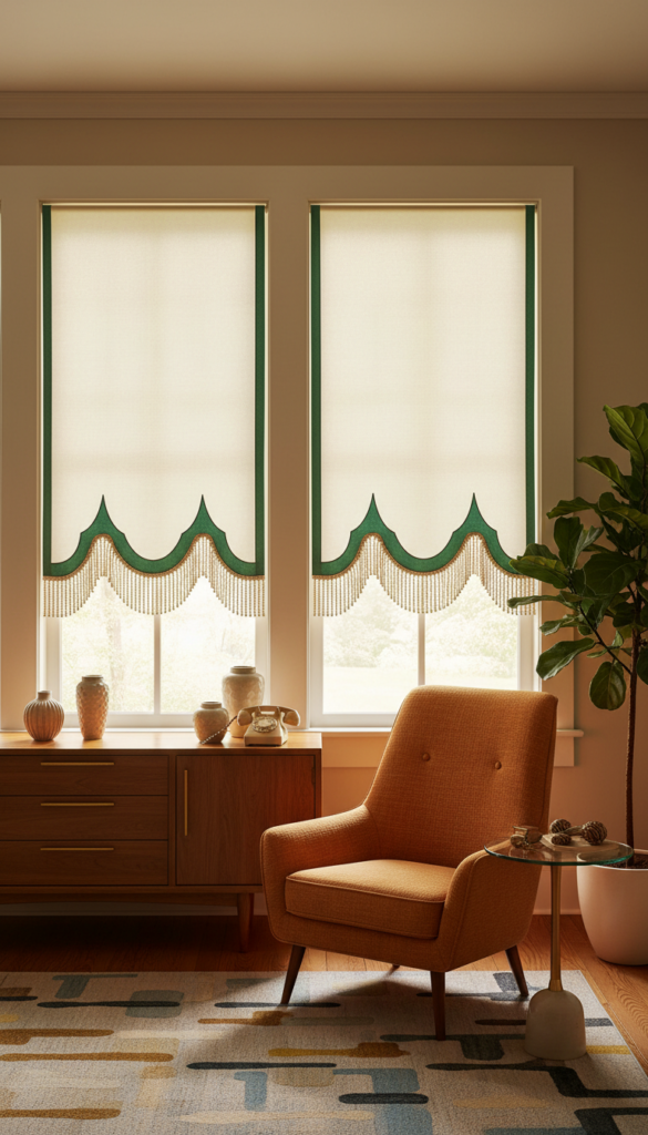 Before blinds became strictly utilitarian rectangles, scalloped hems were the norm. A roller shade with a decorative bottom edge and perhaps a fringe or tassel pull instantly recalls the 1940s and 50s. It’s a clean look with just enough flair to be interesting.