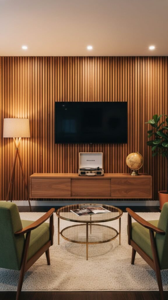 Warm walnut or teak wood paneling instantly evokes the sleek, sophisticated feel of the 1950s and 60s. Applying vertical wood slats behind your television creates a rich, textural backdrop that absorbs sound and hides unsightly cables. This minimalist approach frames your screen naturally while adding architectural interest to a blank wall.