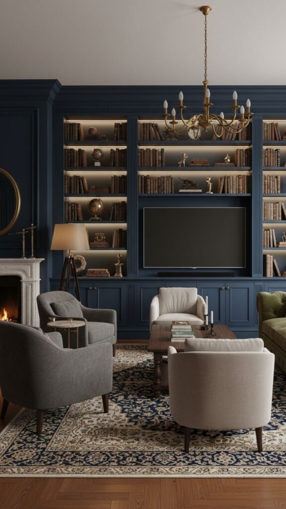 Surrounding your television with floor-to-ceiling antique bookshelves creates the illusion of a grand, historic library. Painting the shelving in a deep, moody color like navy or forest green helps the black screen of the TV blend seamlessly into the background. You can fill the surrounding shelves with leather-bound books and brass accents to distract the eye from the technology.