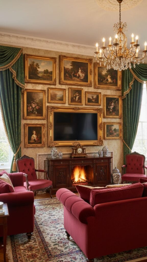 Transform your television into a piece of classic art by treating it as the center of a gallery wall. By placing a custom, ornate gold frame directly around the edges of your screen, the TV masquerades as a vintage oil painting. Surround it with authentic framed artwork from the Victorian era to complete the disguise.