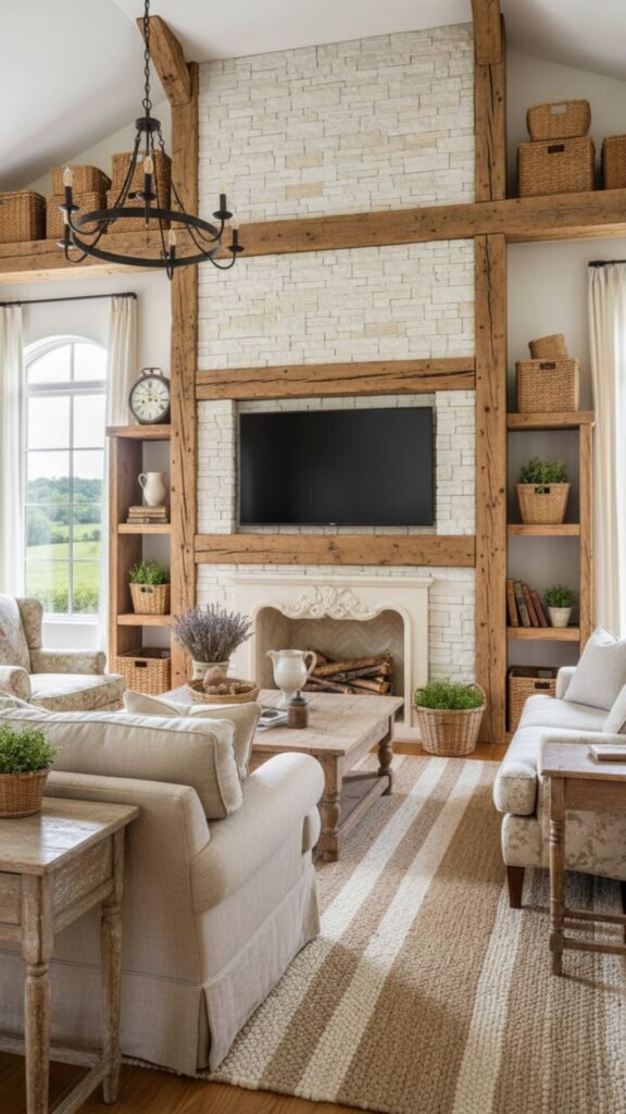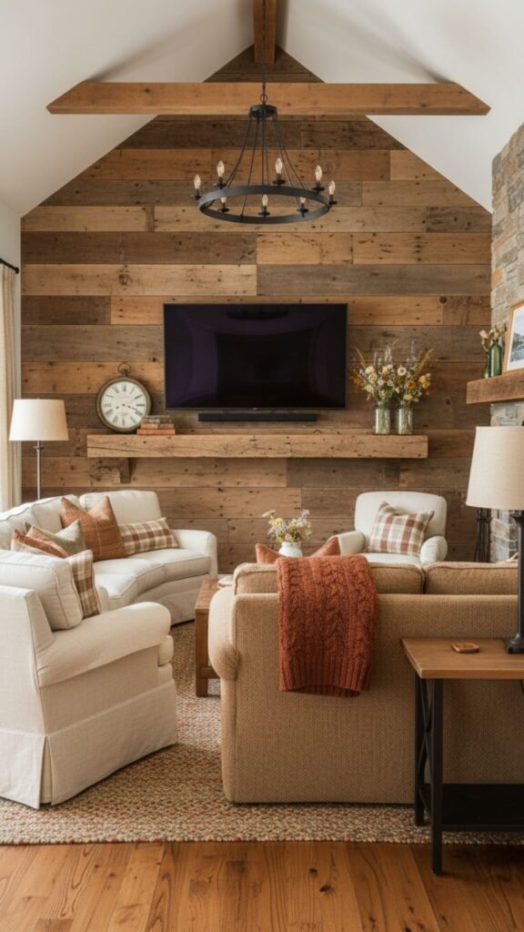 For a cozy, farmhouse-inspired living room, a media wall clad in reclaimed barn wood provides unparalleled texture and history. The weathered gray and brown tones of the aged wood offer a beautiful contrast against the sleek, modern glass of a television. This approach brings warmth and a relaxed, lived-in charm to your entertainment space.
