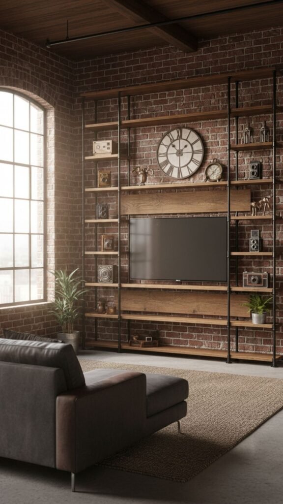 Industrial design celebrates raw materials and utilitarian structures from early 20th-century factories. Building a media wall using black iron plumbing pipes and thick slabs of aged oak creates a rugged, open-concept display. This skeletal framework allows your wall color to show through while providing sturdy support for your electronics and vintage decor.
