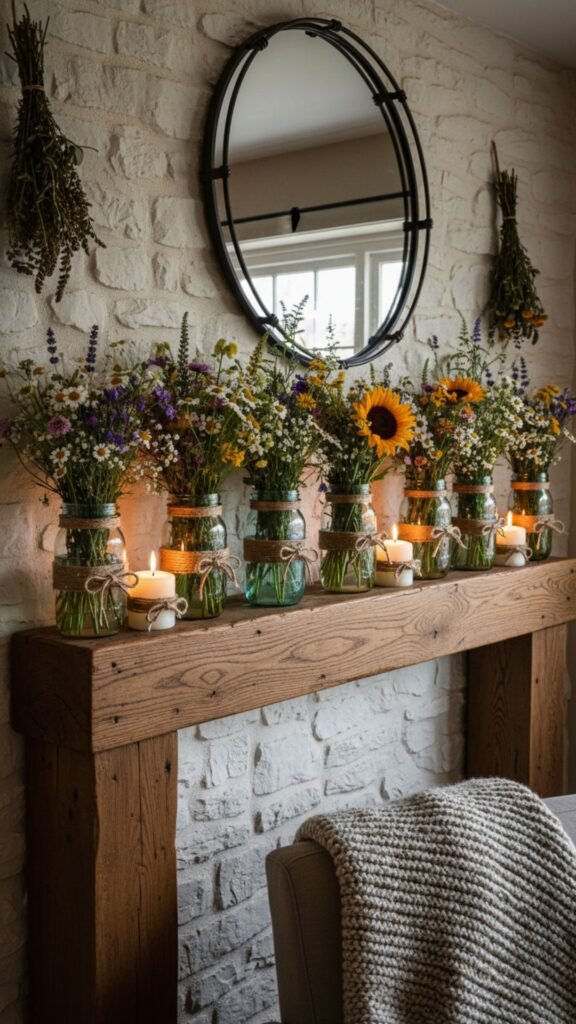 Mason jars are the ultimate staple for rustic home design. They are incredibly cheap and can serve multiple purposes, from holding candles to displaying fresh flowers. Grouping them together on a mantel or coffee table creates a charming, low-cost centerpiece.