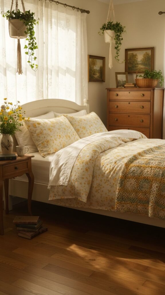 Nothing says vintage quite like classic floral prints. Bedding featuring delicate yellow blossoms adds instant charm and romance to your space. This approach softens the room and invites a cottage-core aesthetic.
